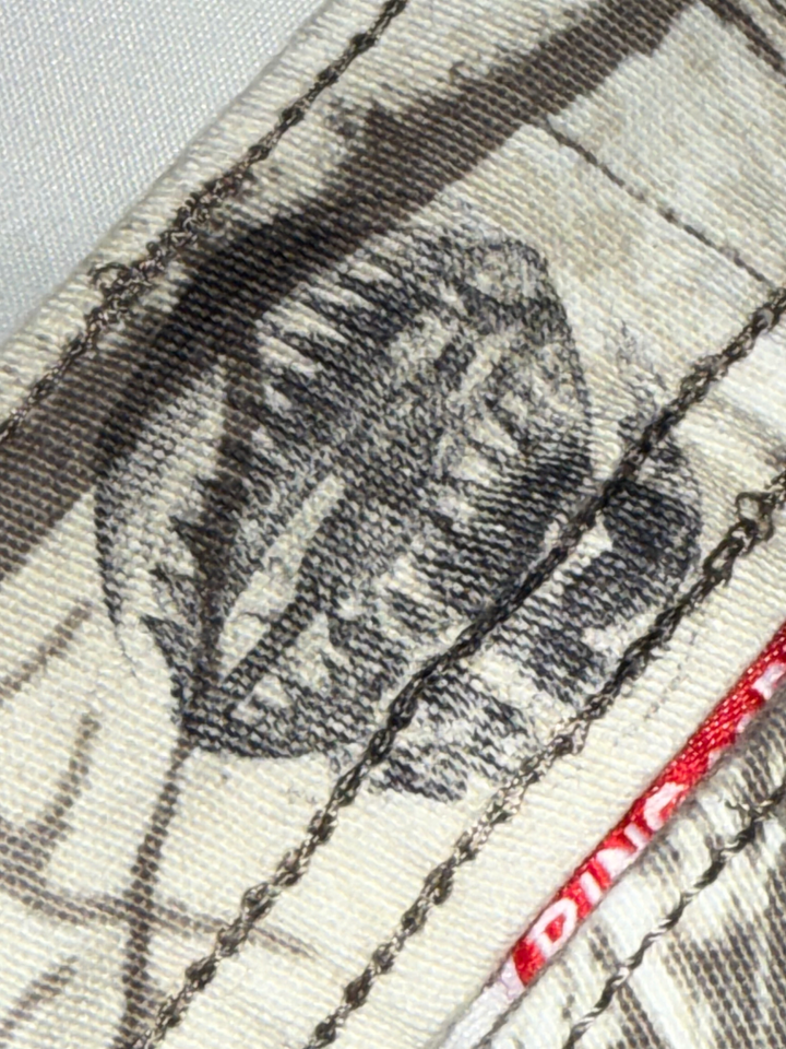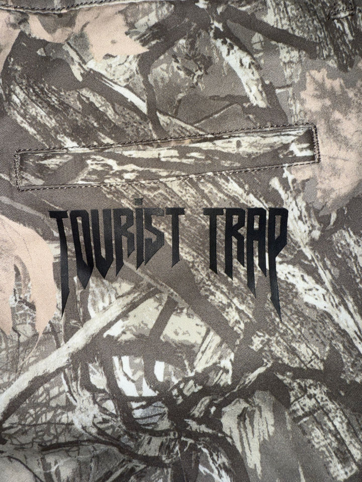 These camo baggy pants have our traditional black logo on the back pocket and our black gator on the bottom left leg. This garment has been repurposed when thrifting and was found new with tags. We have taken this and Trapped it out.